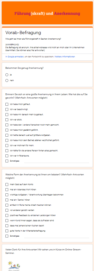 Ich habe für Ihre Vorbereitung eine kurze Vorab-Befragung erstellt. Sie ist anonym, ganz ohne Erfassung persönlicher Daten - Sie können sich also beim Antworten ganz frei fühlen.